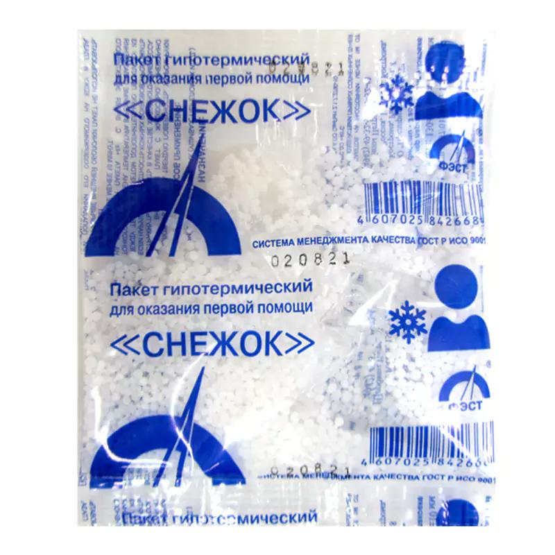 Пакет гипотермический для оказания первой помощи «СНЕЖОК» представляет собой изделие прямоугольной формы, состоящее из наружного пакета из термоформируемой пленки, заполненного азотнокислым аммонием и внутреннего полиэтиленового пакета, заполненного водой.