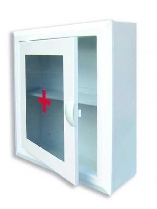 Футляр в виде металлического ящика с габаритами 28 х 23 х 14 см предназначен для размещения средств первой медицинской помощи на предприятиях и в разных организациях. Емкость выполнена из металла, имеет металлическую дверцу со стеклянной вставкой, которая закрывается на защелку.
