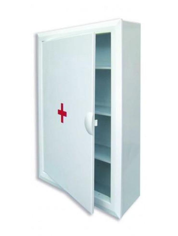 Металлический футляр с большими габаритами 56 х 40 х 14 см предназначен для навешивания в различных учреждениях и организациях. В нем хранят средства оказания первой медицинской помощи и медикаменты, а также другие изделия медицинского предназначения.