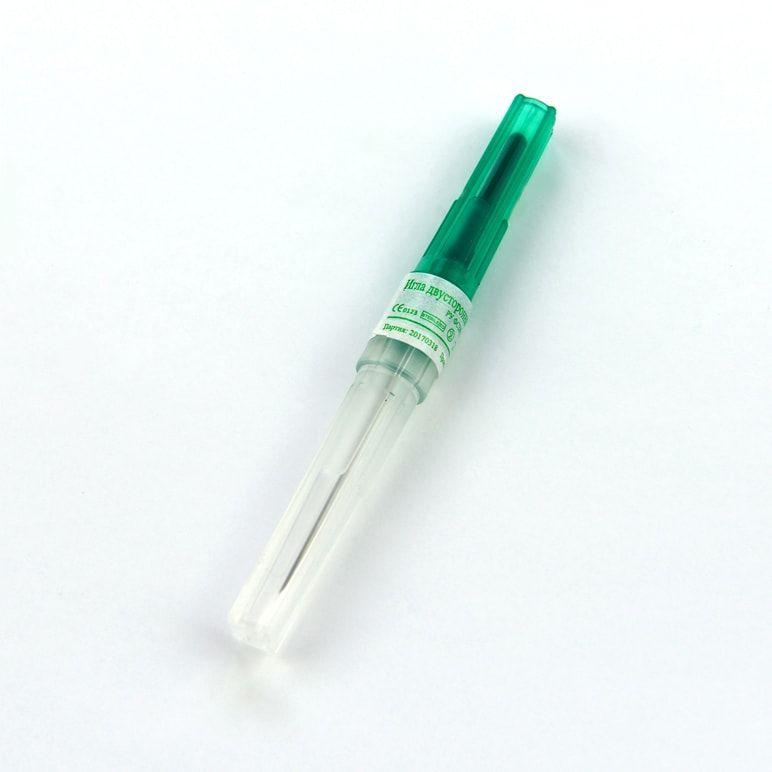 Игла двусторонняя для вакуумной системы забора крови «ЕЛАМЕД» предназначена для забора крови непосредственно из вены пациента в вакуумную пробирку. Одна часть иглы предназначена для введения в вену пациента, другая – закрытая резиновым клапаном, для того, чтобы проколоть резиновую часть крышки пробирки. Наличие клапана сохраняет герметичность системы во время смены пробирок. Двусторонняя игла обеспечивает закрытость системы, при которой кровь попадает в пробирку без контакта с внешней средой.