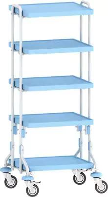 Тележка лапароскопическая пятипанельная для размещения и транспортировки лапароскопических приборов и инструментов. Предназначена для применения в лапароскопических отделениях лечебных учреждений.