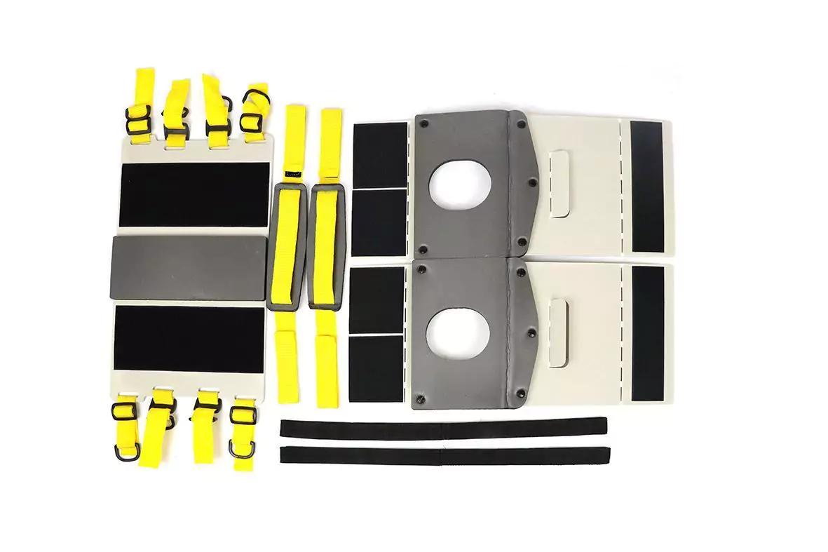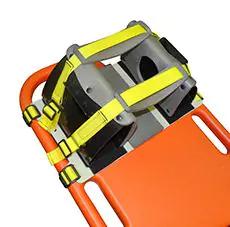 Фиксатор головы состоит из основания, которое непосредственно крепится к щиту с помощью застежки «велькро» и двух фиксирующих ремней, двух боковых опор с прорезями для ушей пациента, ремней для фиксации лба и подбородка пациента. Ремни для фиксации основания и лба (подбородка) пациента соединяются с основанием с помощью текстильных крепежей. Со стороны пациента на основании и опорах расположены съемные эластичные вставки.