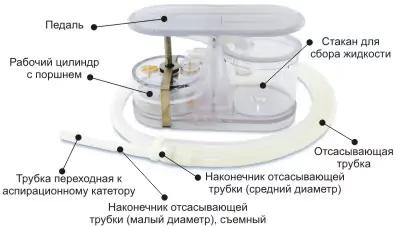 Преимущества: аспиратор медицинский (отсос медицинский) обеспечивает высокую эффективность аспирации (на густом аспирате до 2 л/мин) при минимальных усилиях и портативных размерах. Двухтактный принцип работы поршня позволяет создавать разряжение как на прямом, так и на обратном ходу поршня. При этом вдвое увеличивается эффективность и производительность аспирации. Благодаря оригинальным конструкторско-технологическим решениям усилие нажатия на педаль требуется небольшое, что позволяет производить нажатие как ногой (в том числе в положении сидя), так и рукой. В аспираторе медицинском имеется защита от переполнения сборника жидкости. В качестве опции предлагаются аспирационные катетеры разных размеров.
