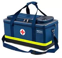 Содержимое размещено в компактной медицинской сумке синего цвета, изготовленной из водостойкой прочной ткани. Для надежной фиксации всех материалов внутри футляра имеются клапаны, петли и перегородки. Снаружи есть дополнительные вместительные отделения. Для удобной транспортировки сумка оснащена прочными ручками и широким ремнем.