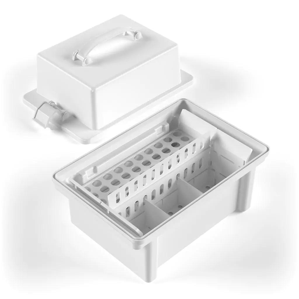 Укладка-контейнер состоит из корпуса-поддона, подставки для пробирок (2 шт.), фиксаторов и крышки с ручкой и защелками.