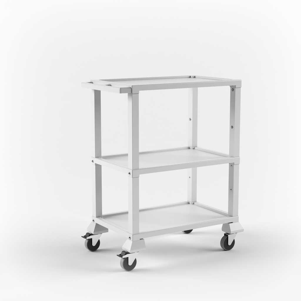 Представляет собой конструкцию из пластика белого цвета, сочетает малый вес с прочностью, устойчивостью и значительной грузоподъемностью. Состоит из трёх полок, соединённых стойками. Стеллаж установлен на четырех поворотных колесных опорах. Два колеса снабжены тормозами.