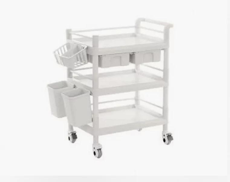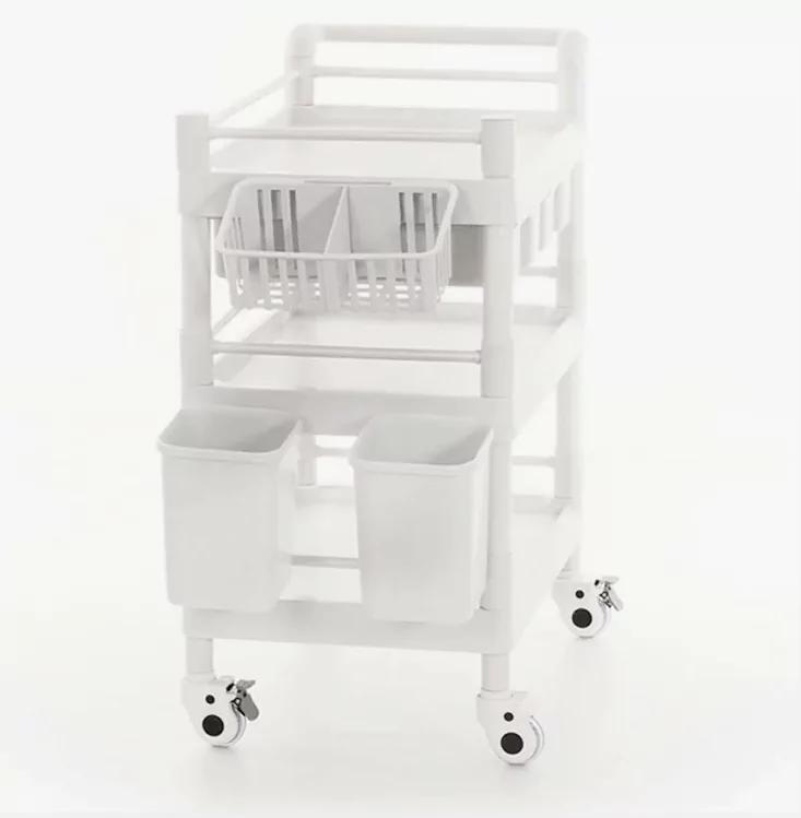 Каркас изготовлен из ABS-пластика белого цвета, сбоку расположена ручка для удобного перемещения тележки между отделениями