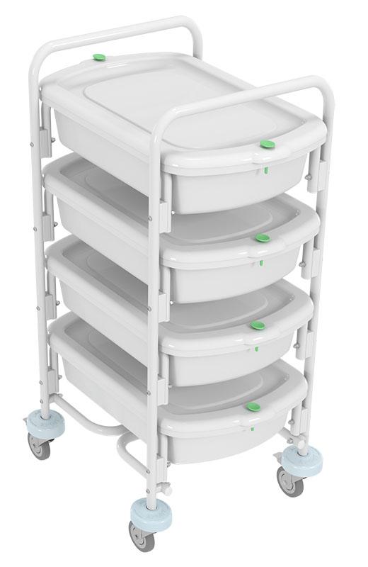Конструкция Тележка с контейнерами представляет собой четырехъярусную рамную конструкцию. Каждый ярус состоит из контейнера (ванна с крышкой) для размещения эндоскопов: транспортировка и временное хранение эндоскопа, прошедшего обработку, транспортировка и временное хранение контаминированных эндоскопов. Тележка выполнена из стальной трубы круглого сечения диаметром не менее 22мм с порошковым покрытием.